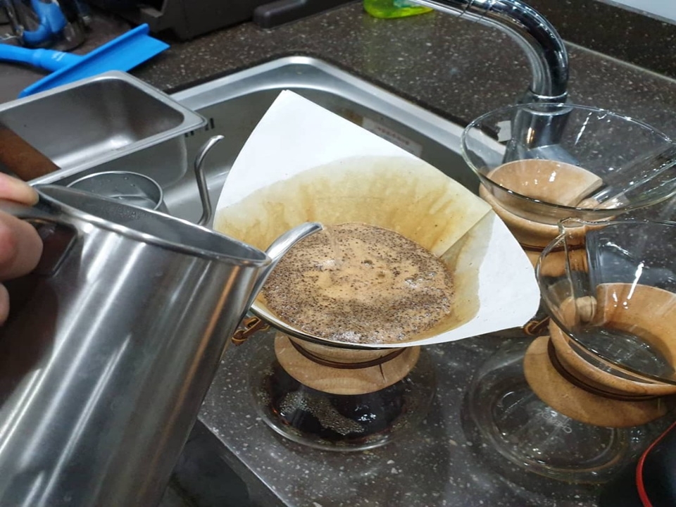 이제 이론에 대한 수업을 끝이 났어요.(드디어 ㅠㅠ) 각각의 원두에 대한 맛 평가를 하기 위해 강사님께서 원두를 분쇄해서 핸드드립으로 커피를 추출해 주셨어요~