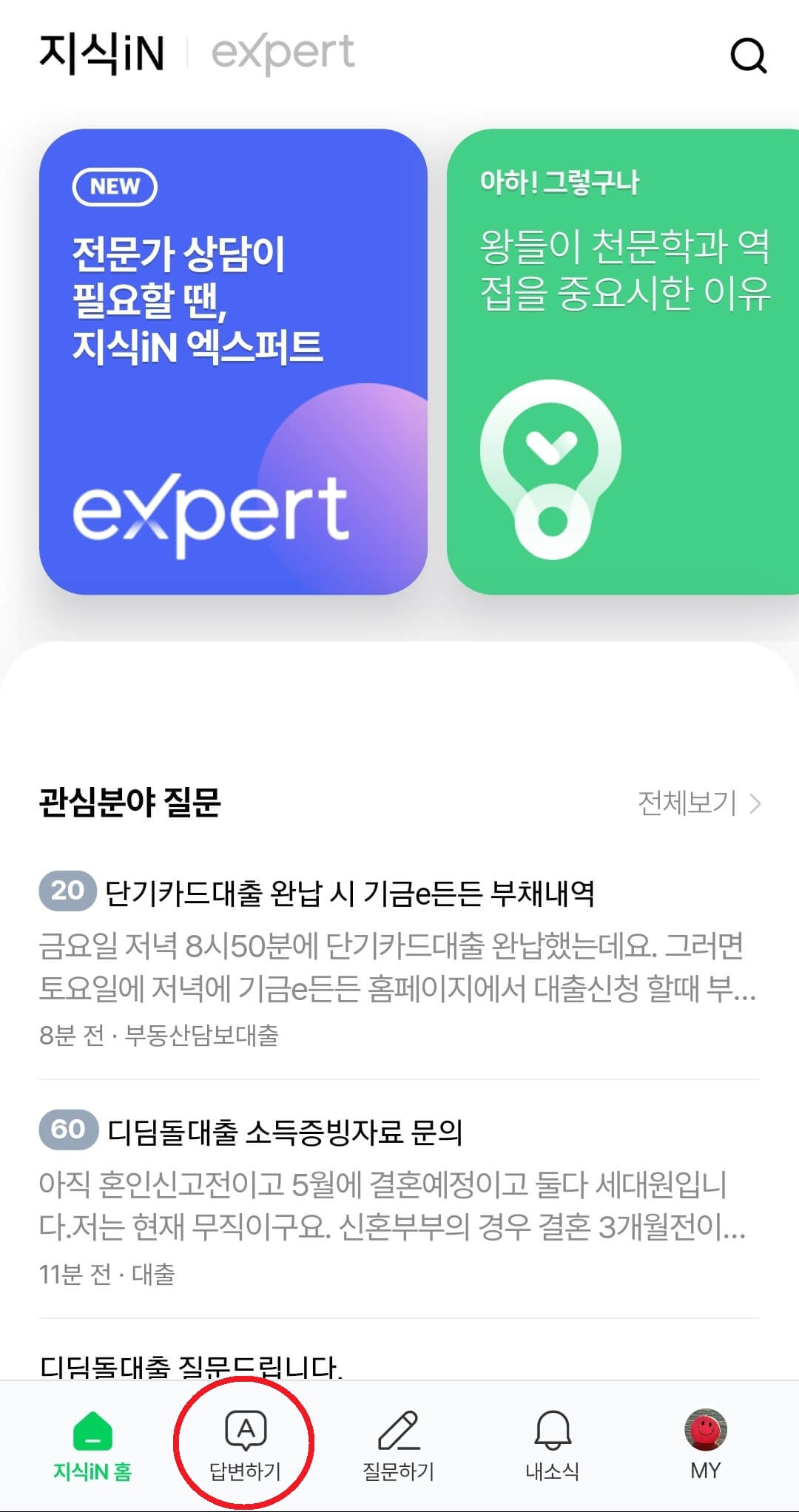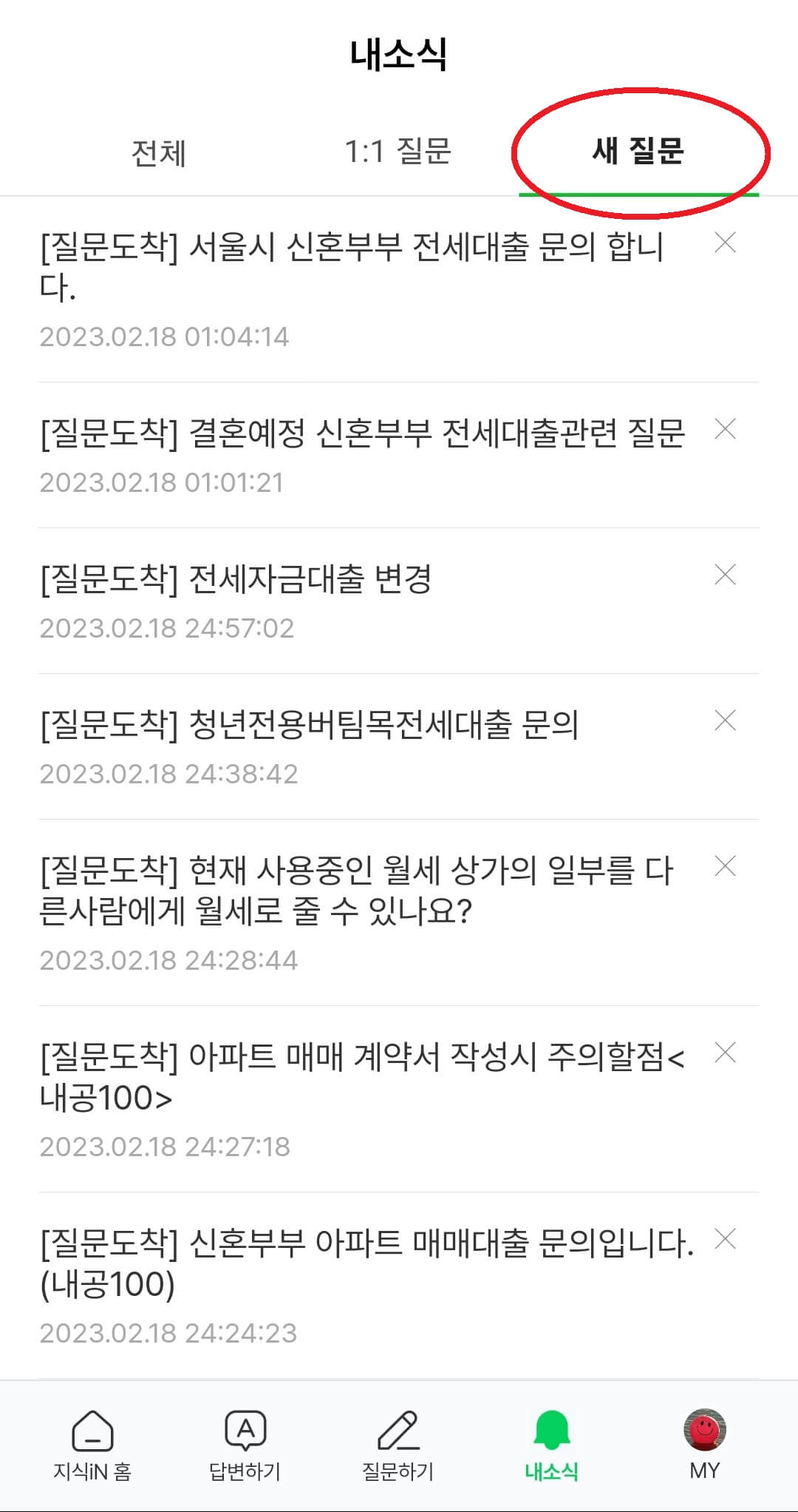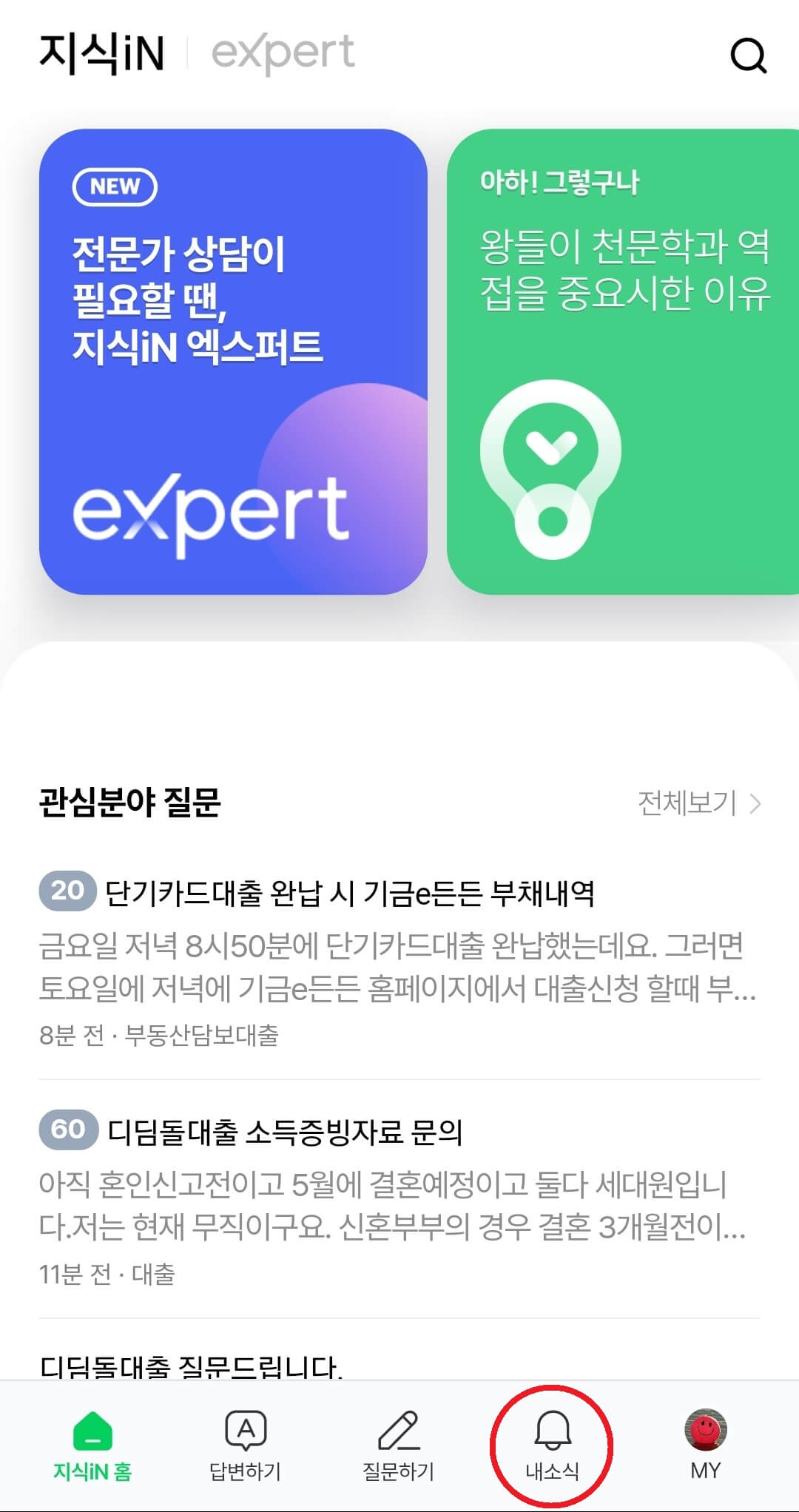 이렇게 알림설정을 하고 나면 키워드 알림성정이 잘 되었는지 확인을 해주셔야 하는데 다시 본화면 아래항목에 있는 '내소식'을 눌러주시고 오른쪽 화면에 있는 전체, 1:1질문, 새 질문 항목에서 '새 질문' 항목을 눌러주시면 내가 선택했던 키워드 항목관련된 글들을 확인하실 수가 있어요. 저는 부동산 대출관련해서도 키워드를 넣었더니 여러가지 대출 관련된 질문들이 보이네요 ㅎㅎ 요즘 워낙 부동산쪽으로 이슈가 되고 있다보니 관심이 더 가더라구요~