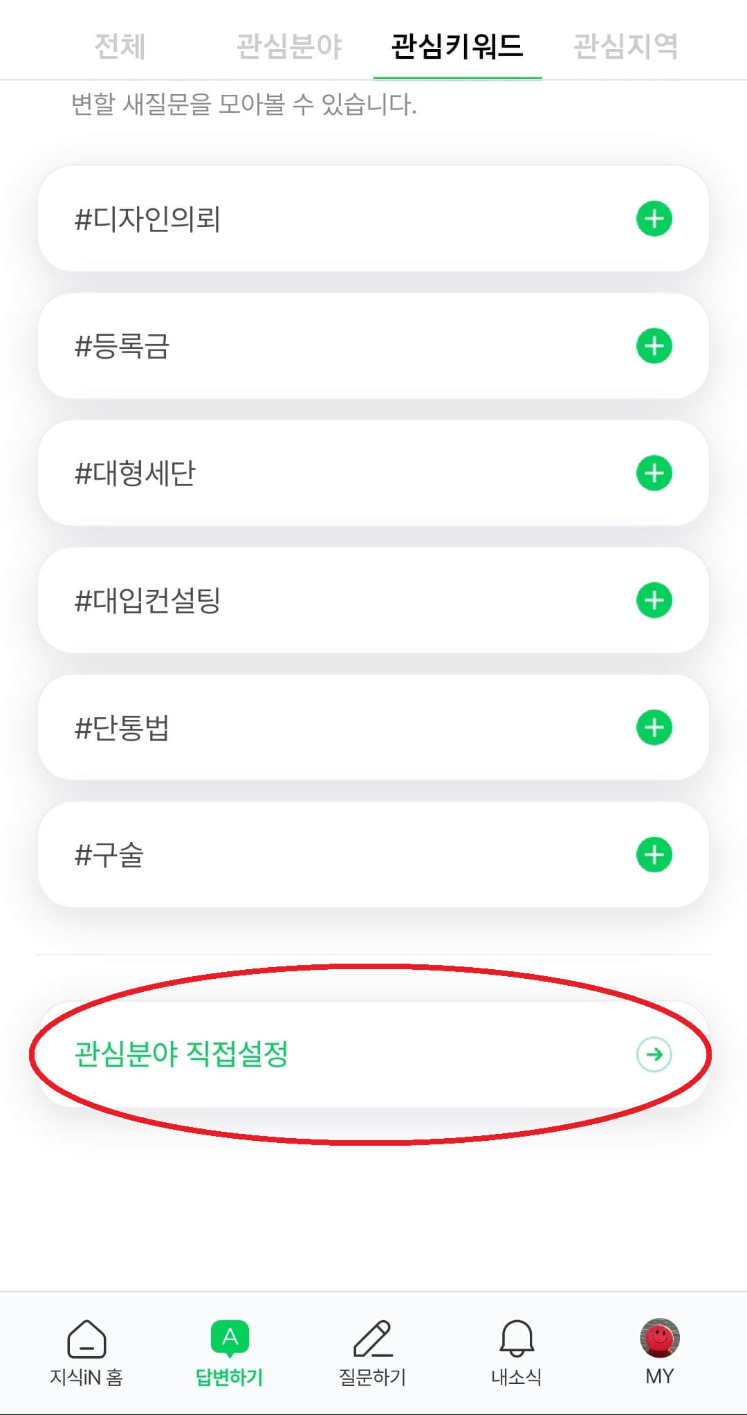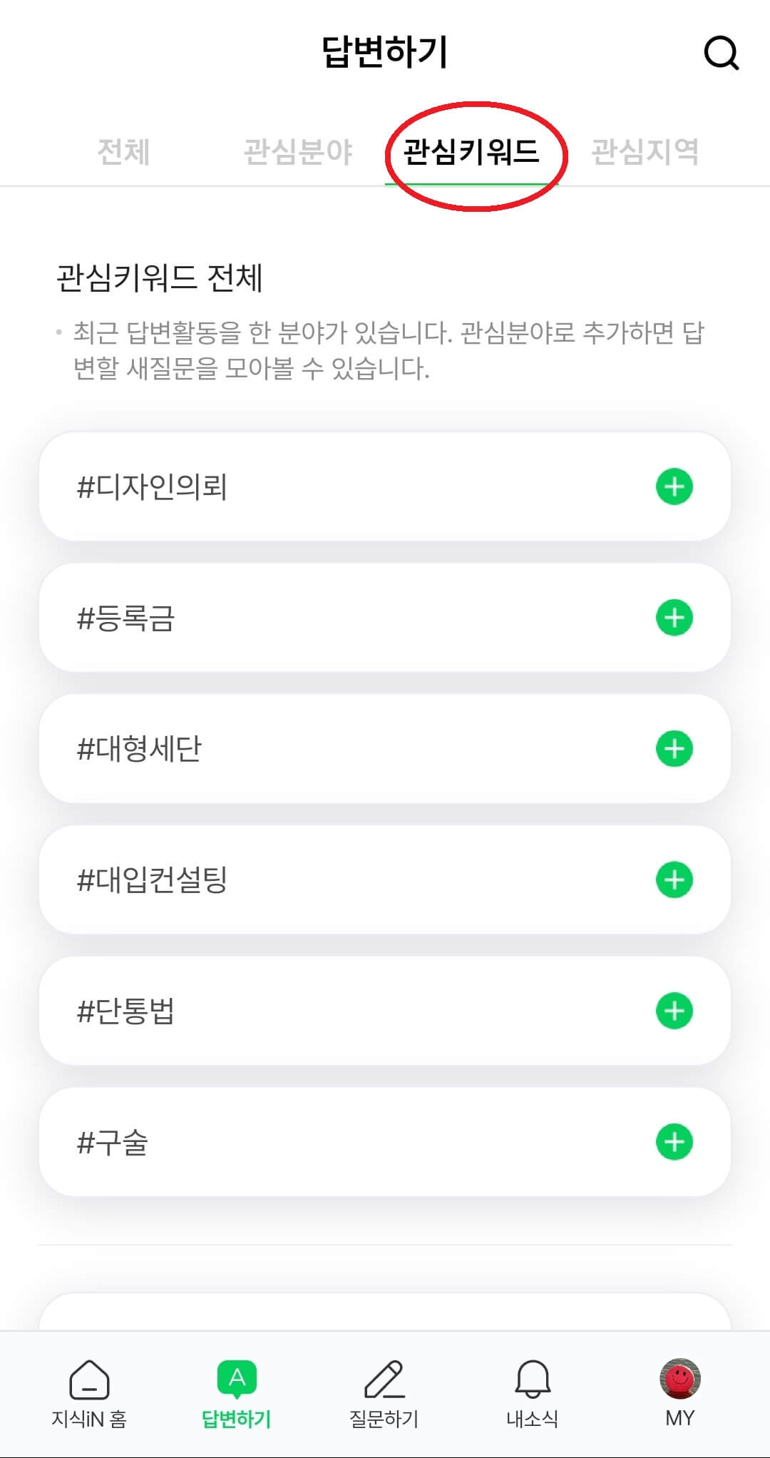답변하기 항목에 들어오시면 상단에 전체, 관심분야, 관심키워드, 관심지역 이렇게 나눠져 있는데 저희는 키워드를 설정해서 알림을 받기위해서 '관심키워드' 항목을 눌러줍니다. 관심키워드를 설정하면 내가 원하는 특정 키워드에만 알림이 떠서 유용합니다.