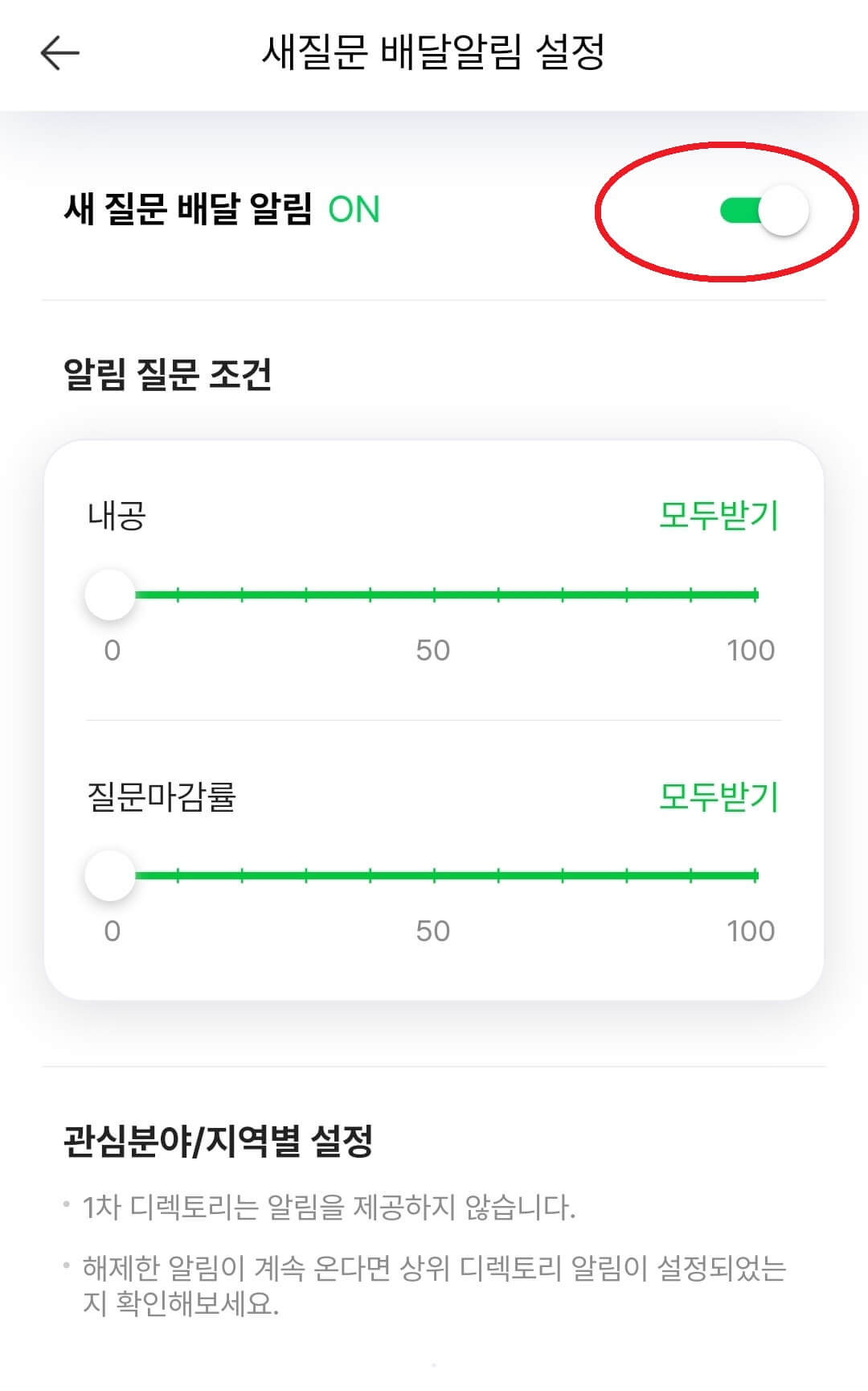 설정 항목에 들어오시면 여러가지 항목들이 많이 보이실텐데 그 중에서 맨 밑에 있는 '새 질문 배달' 이 현재는 OFF로 되어 있는 걸 확인하실 수 있어요. OFF로 되어 있는 걸 눌러주시면 오른쪽 화면으로 넘어갑니다. 그럼 해당화면에서 ON으로 바꿔주기 위해 해당 버튼을 눌러주시면 됩니다^^