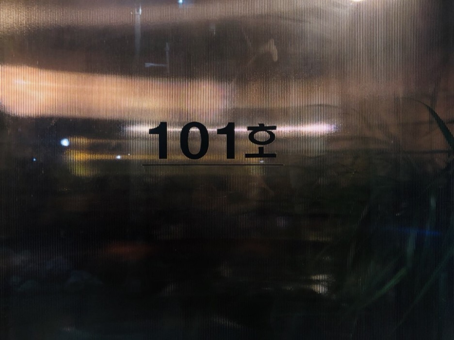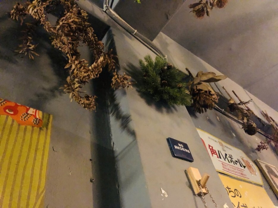 #101호사케집 벽 위에는 풀로 장식이 되어있었고요. 거울이 있었는데요.