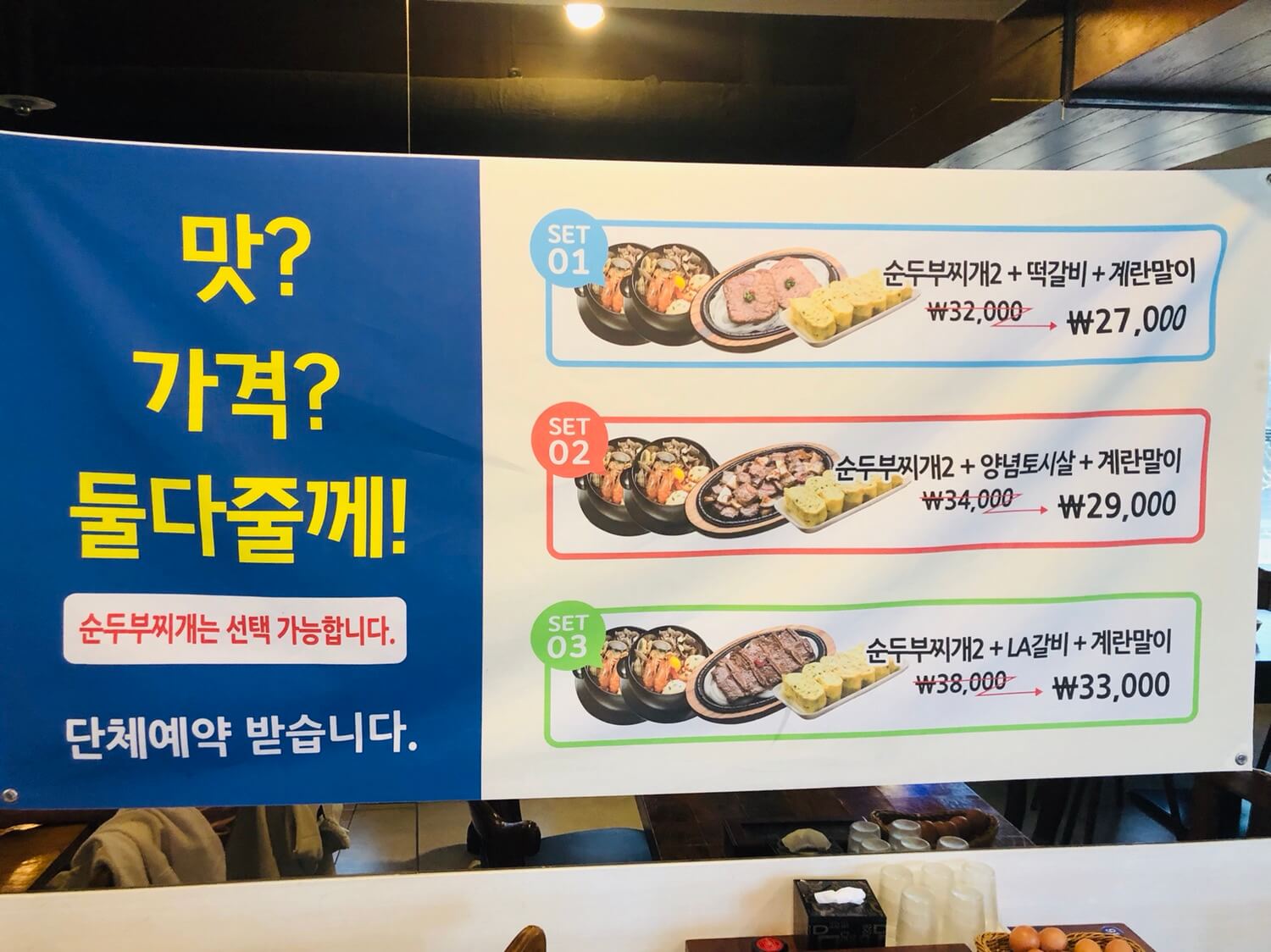 세트1,2,3번 안에 기본적으로 순두부찌개가 포함되고, 각각 떡갈비, LA갈비 등등 여러가지 메뉴들이 잘 구성되어 있네요
