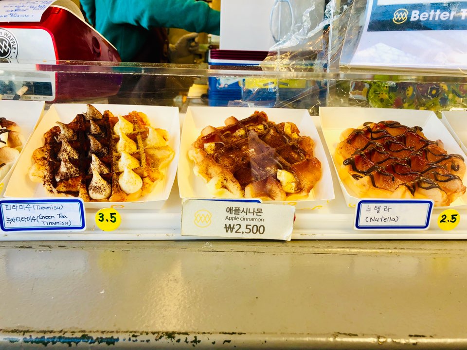 왼쪽부터 망고 크림치즈 와플, 그 옆이 애플 생크림 와플이에요. 모형보다 더 먹음직스럽게 생긴 거 같아요~ㅎㅎ